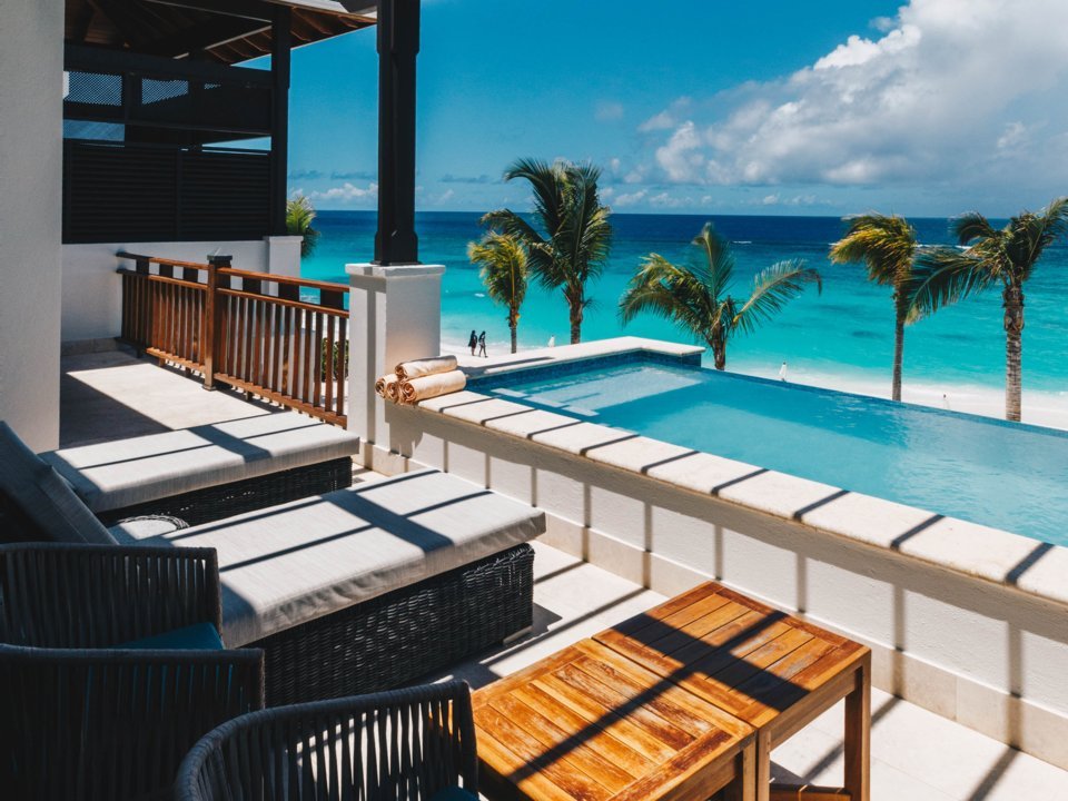 Anda bisa memilih bungalo di atas air jika ingin berada sedekat mungkin dengan air. Ada juga vila privat dengan bagian lantai kaca sehingga Anda bisa mengintip kehidupan laut di Karibia.