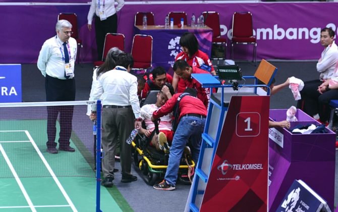 MARGOPOST.COM | JAKARTA – Presiden Joko Widodo mendatangi Anthony Sinisuka Ginting yang cedera saat bertanding melawan Shi Yuqi pada partai pertama, final beregu putra Indonesia vs China di Istora Gelora Bung Karno, Jakarta, Rabu 22 Agustus 2018.