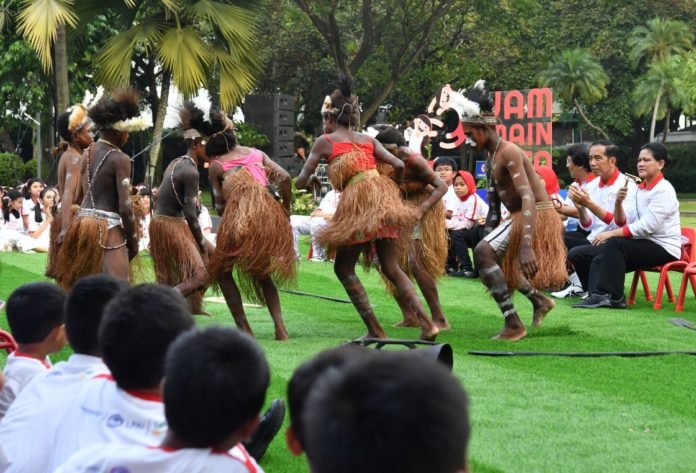 Keduanya kemudian menyaksikan seni tari yang dibawakan oleh sejumlah anak yang datang dari Kota Agats, Kabupaten Asmat, Papua. Setelahnya persembahan lagu-lagu Nusantara didendangkan oleh sejumlah anak dari “Voice of Indonesia”.