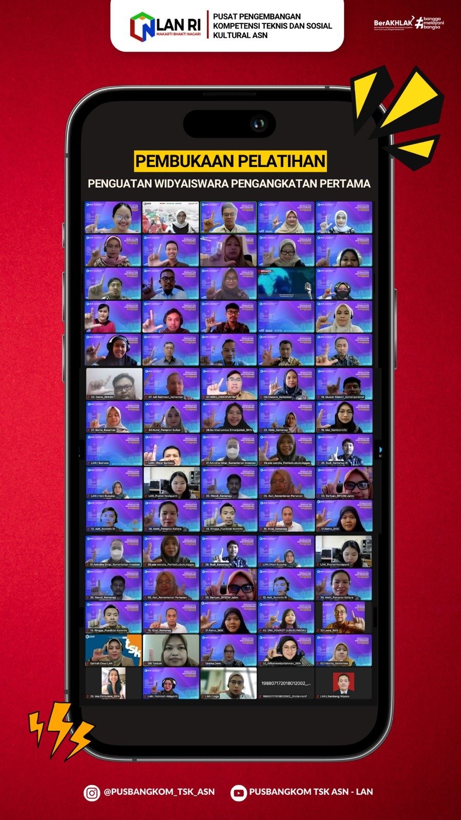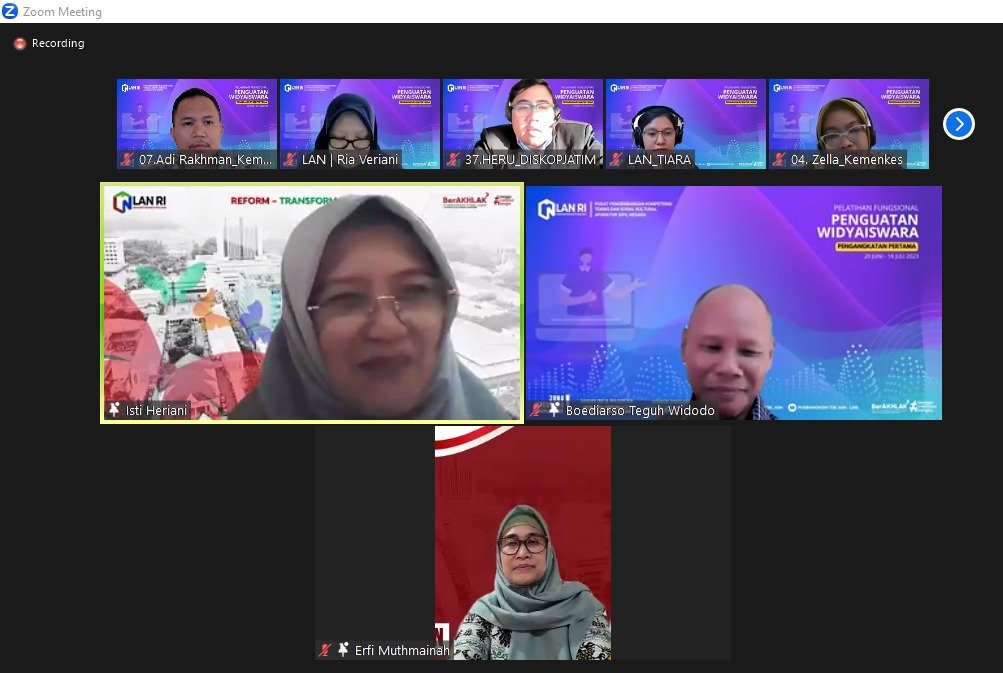 Lembaga Administrasi Negara (LAN) RI menyelenggarakan kegiatan Pelatihan Fungsional Widyaiswara Pengangkatan Pertama pada tanggal 20 Juni 2023 sampai dengan 21 Juli 2023 secara daring. Pelatihan dibuka oleh Sekretaris Utama Lembaga Administrasi Negara (LAN) RI, Dra. Reni Suzana, MPPM.