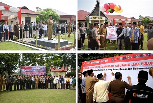 MARGOPOST.COM | Sarilamak – Polres Lima Puluh Kota bersama dengan KPU, Bawaslu Lima Puluh Kota dan jajaran pemerintah daerah mendeklarasikan Pemilu 2019 yang Aman, Damai dan Berdunsanak di Lapangan Kapolres Lima Puluh Kota, Sarilamak Senin (17/9/2018).