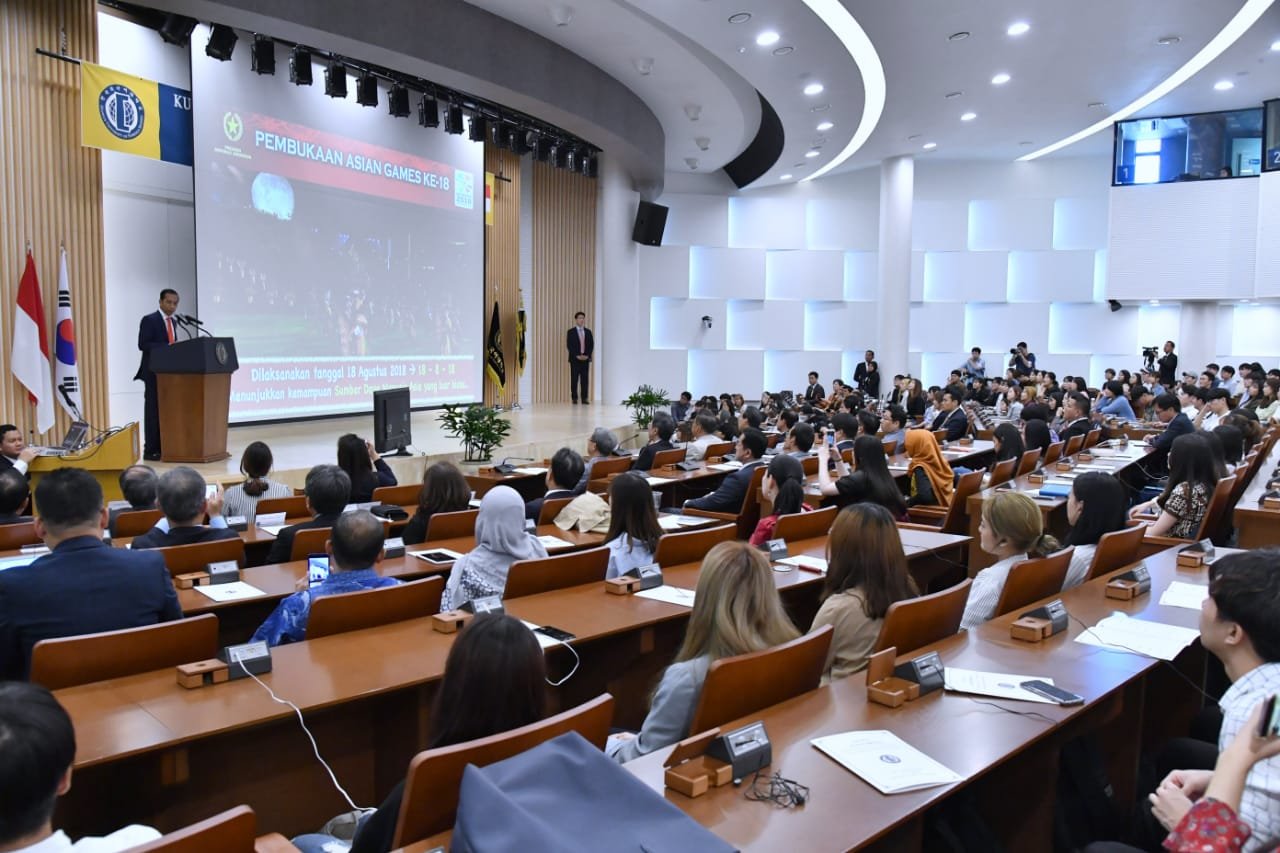 MARGOPOST.COM | KOREA SELATAN – Presiden Joko Widodo memberikan kuliah umum bagi para mahasiswa di Hankuk University of Foreign Studies (HUFS), Seoul, Korea Selatan, pada Selasa, 11 September 2018.