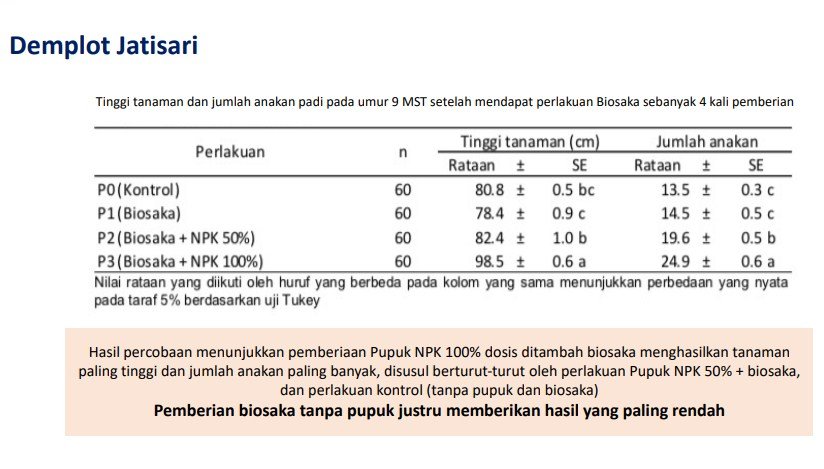 Tim IPB tentang Biosaka, katanya lagi, terlalu dini apabila penerapan Biosaka diklaim dapat menekan penggunaan pupuk NPK 50%, rujukannya hasil Demplot petani yang diklaim menunjukkan pertumbuhan tanaman dan hasil demplot yang tidak berbeda nyata antara perlakuan Biosaka + NPK 50% dengan Biosaka + 100% NPK.
