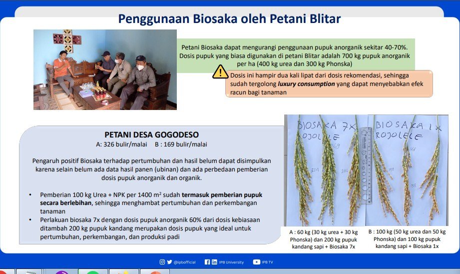 Dr Ir Arief Hartono MSc menambahkan bahwa Tim Kajian Biosaka IPB menggelar Focus Group Discussion [FGD] melalui kunjungan lapang ke Blitar, Jawa Timur pada 17 – 20 Februari dilanjutkan ke BBPOPT Jatisari di Karawang, Jawa Barat pada 10 Maret 2023 berlanjut ke Klaten di Jawa Tengah pada 10 – 12 Maret 2023.