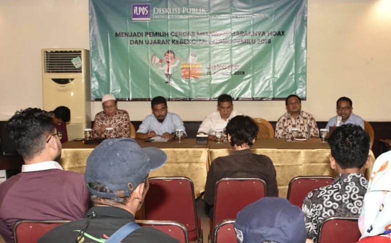 Diskusi Publik yang diselenggarakan oleh Institute for Indonesia Lokal Policy Studies (ILPOS) yang membahas mensosialisasikan pemilih cerdas melawan maraknya hoaks dan ujaran kebencian menjelang Pemilu 2019. **