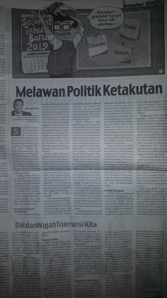 Namun, refleksi politik sepanjang 2018 menunjukkan kecenderungan dampak global penggunaan politik ketakutan atau politics of fearmulai muncul di negeri ini jelang Pemilihan Presiden 2019. Semoga fenomena ini berakhir pada 2018—dan memasuki 2019—atmosfer politik akan lebih diwarnai oleh politik akal sehat yang mencerdaskan rakyat.