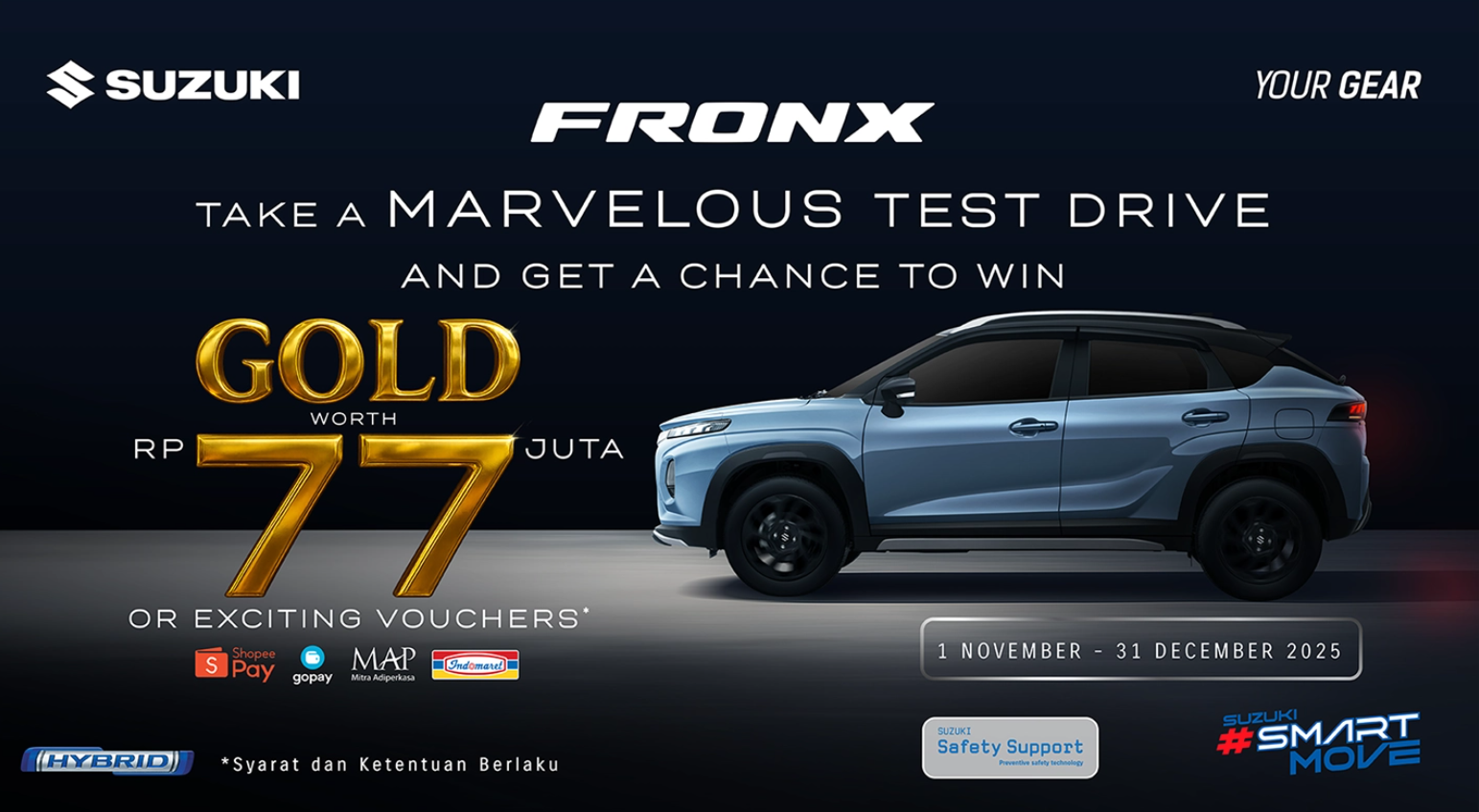 Program ini menjadi bentuk apresiasi Suzuki kepada masyarakat yang telah meluangkan waktu untuk merasakan langsung pengalaman berkendara bersama Suzuki Fronx, SUV Hybrid terbaru yang memadukan desain modern, teknologi canggih, serta efisiensi berkendara yang semakin relevan dengan kebutuhan masa kini.