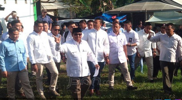 Saat datang ke lokasi, Prabowo tampak berpeci hitam dan bersafari khasnya warna putih. Prabowo memakai pantalon dan sepatu cokelat.