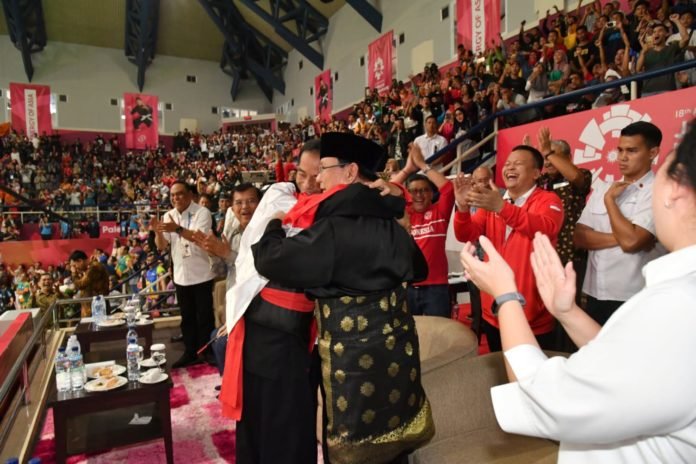 Ia kemudian memegang tangan Presiden, menyatukannya dengan tangan Prabowo, lantas memeluk keduanya. Momen ini pun disambut riuh tepukan penonton yang memadati venue pencak silat.